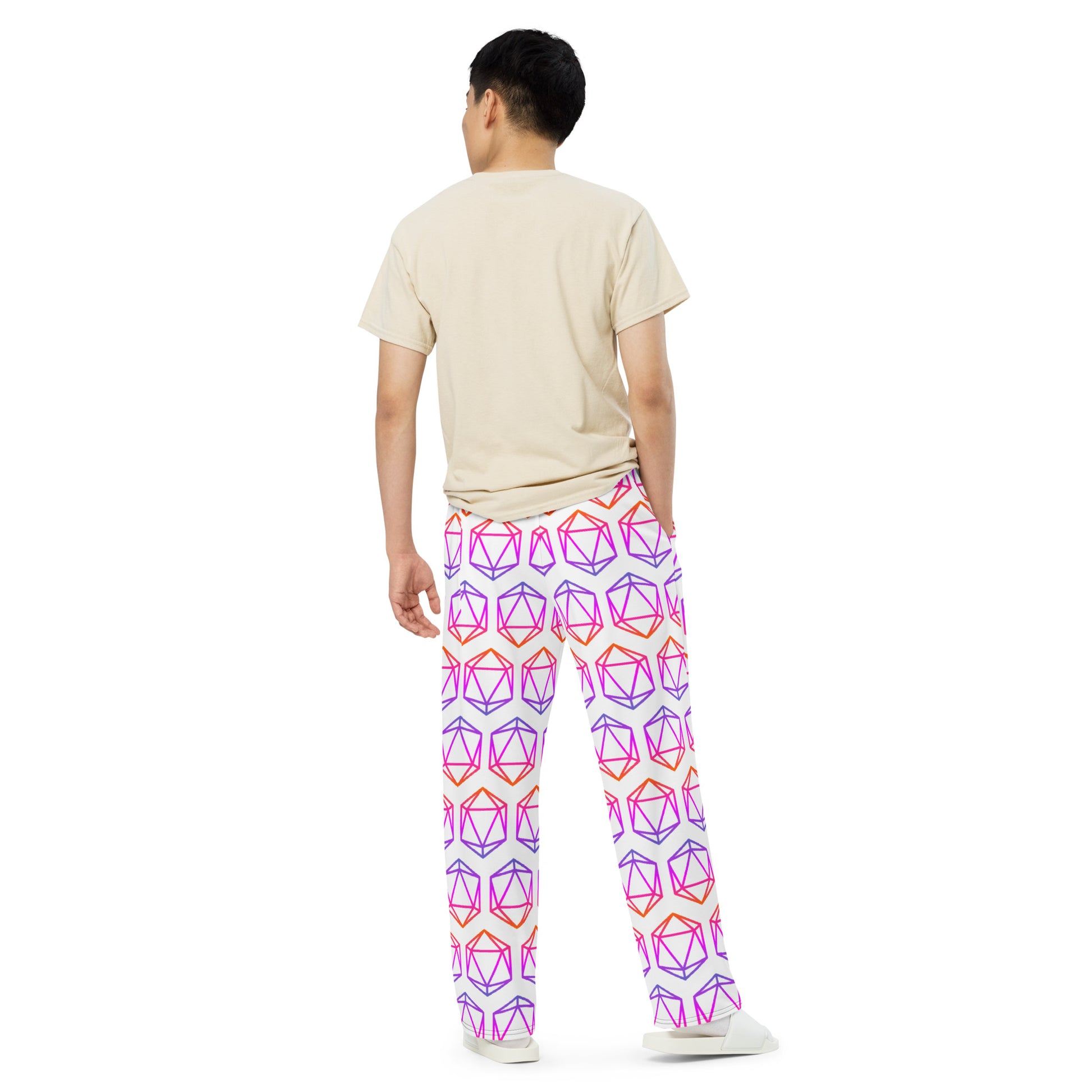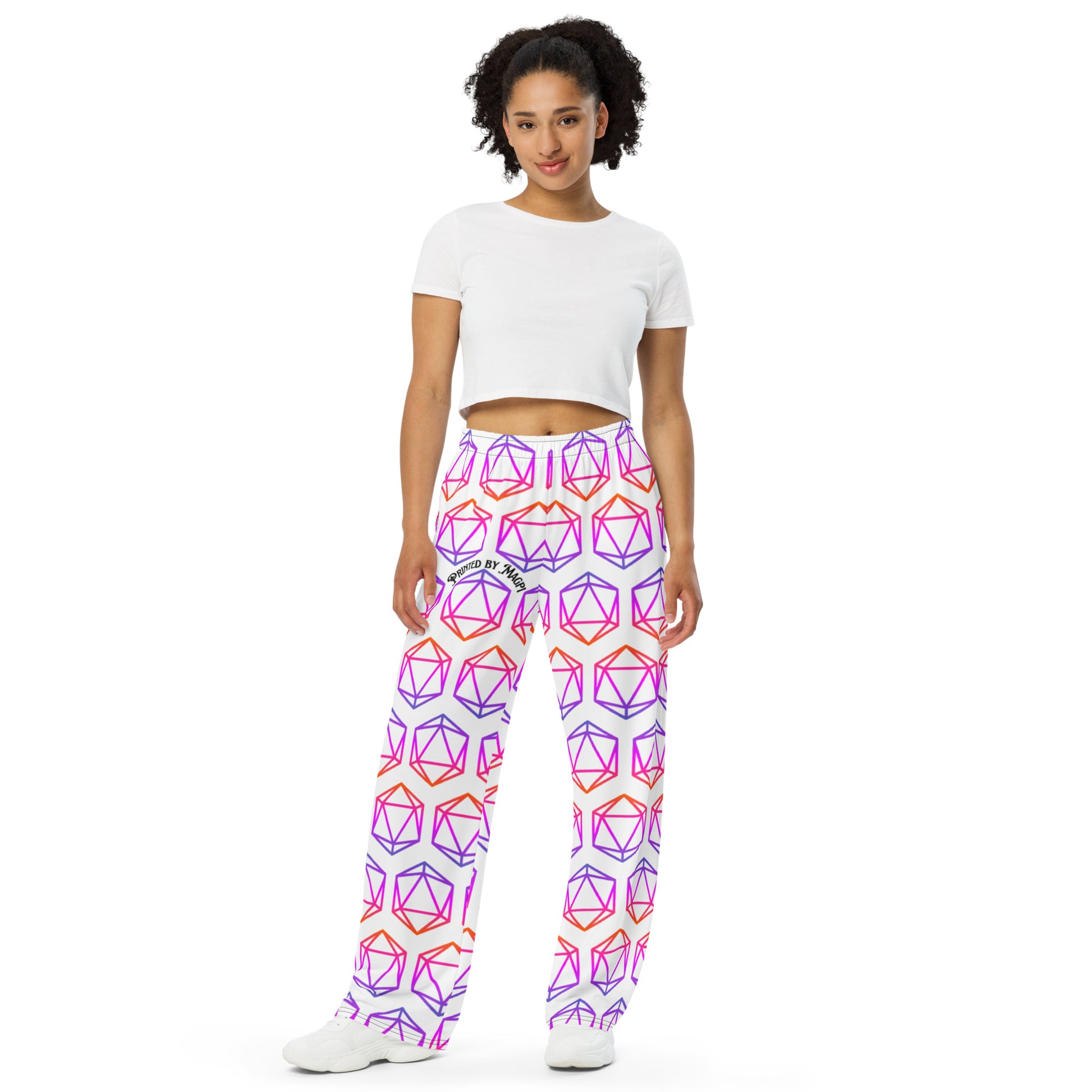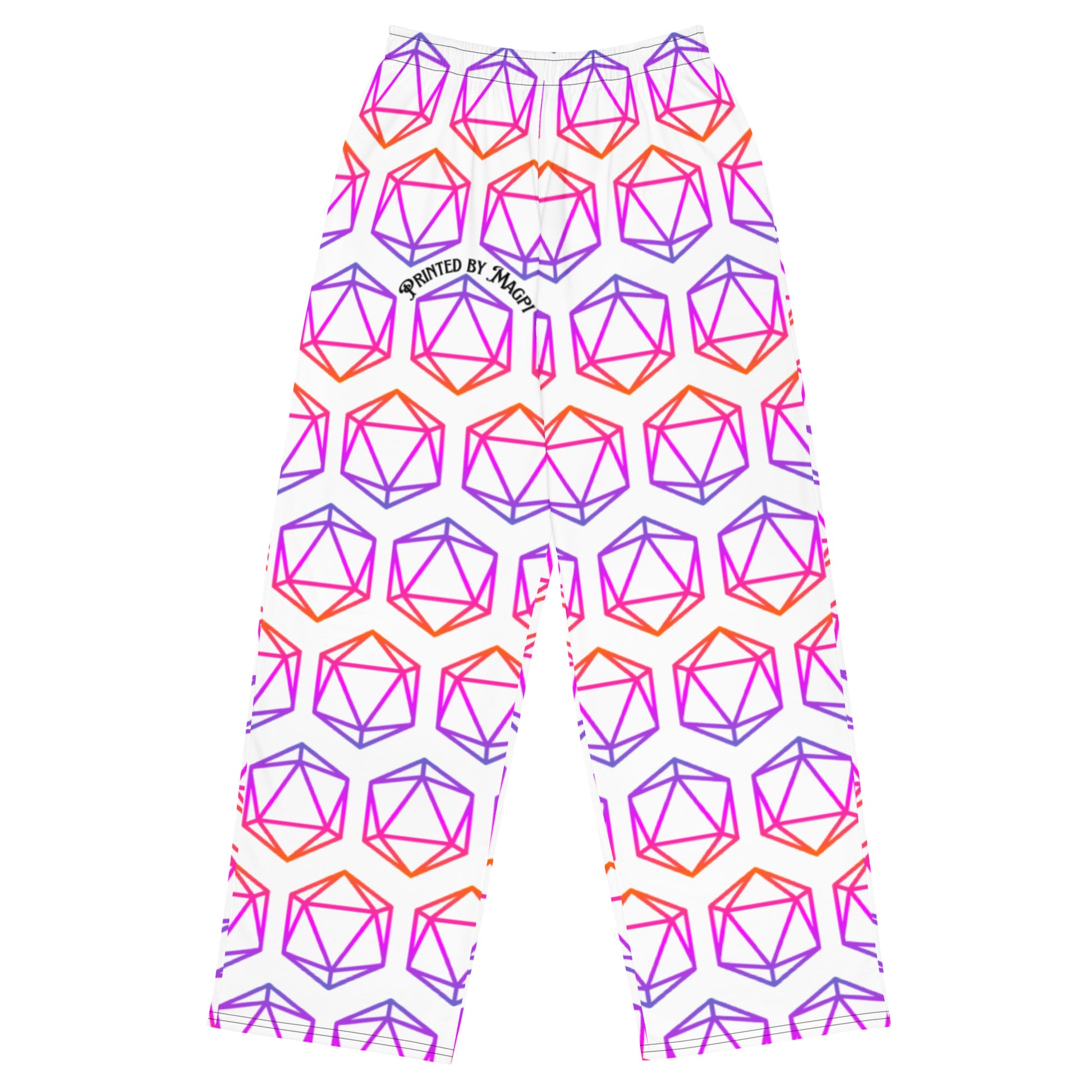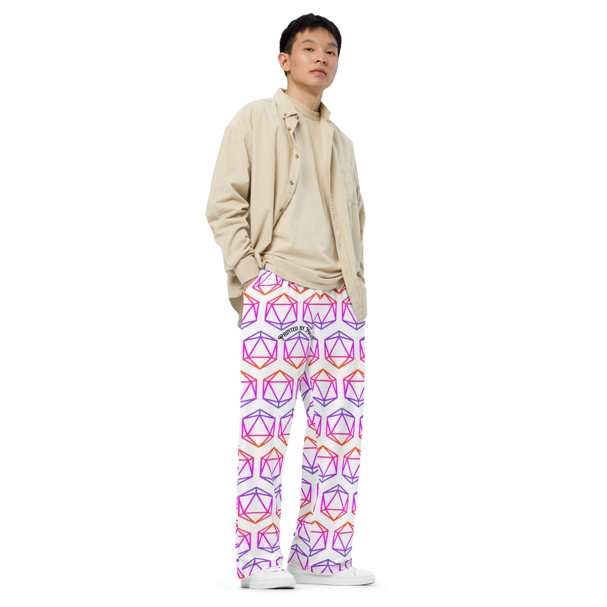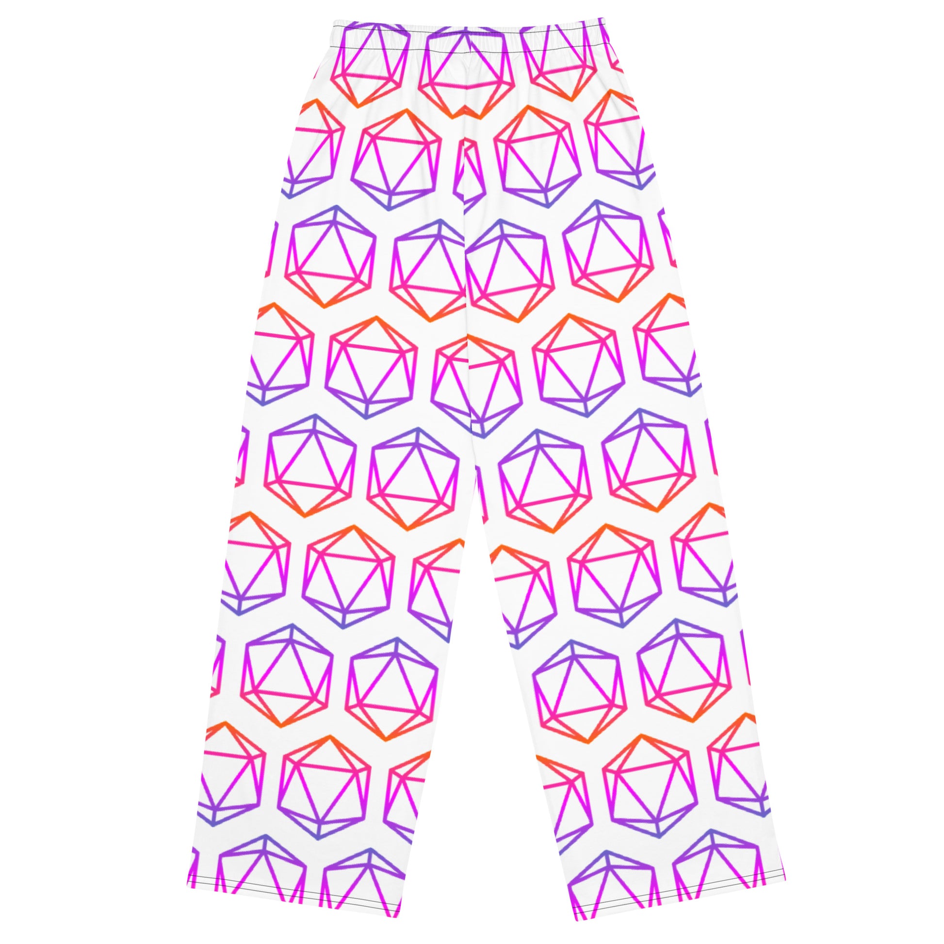 These wide-leg pants are covered in a vibrant constellation of neon D20 dice in fiery red, arcane purple, and chaotic pink—perfect for the tabletop tactician who values both style and stretch.