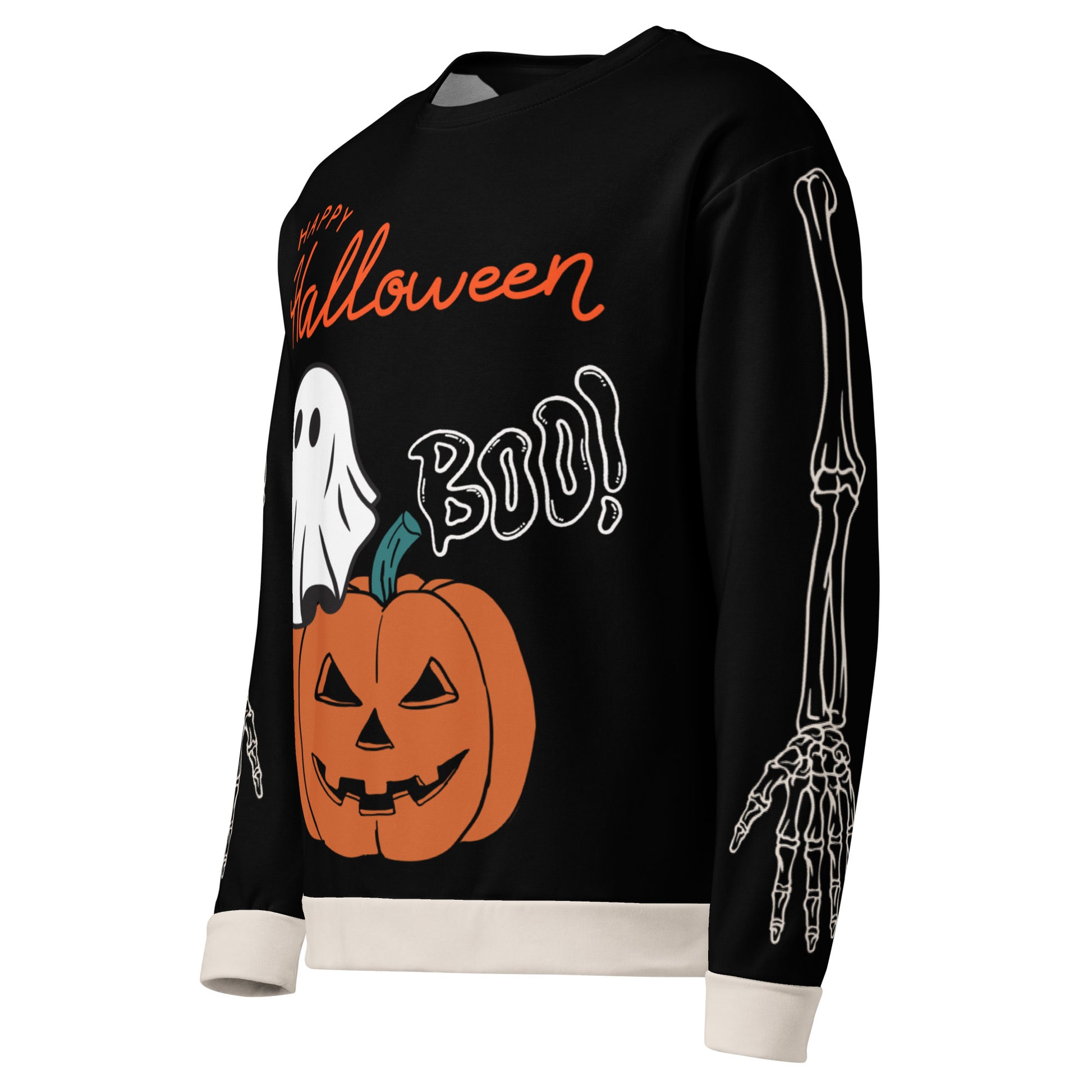 Step into a world of autumn magic with this festive Halloween sweater! Ghosts, ghouls, and pumpkin grins—oh my! This cozy Halloween sweater is a must-have for spooky season lovers. Featuring a cheerful jack-o'-lantern, a friendly ghost, and bold “BOO!” lettering, it’s cute, comfy, and ready for haunted hayrides, trick-or-treat duty, or lounging in fall vibes. Skeleton arms down the sleeves add just the right touch of creepy-cute. Wear it to invite the spirit of Halloween into every adventure. Will you claim this hauntingly delightful treasure? 🎃👻