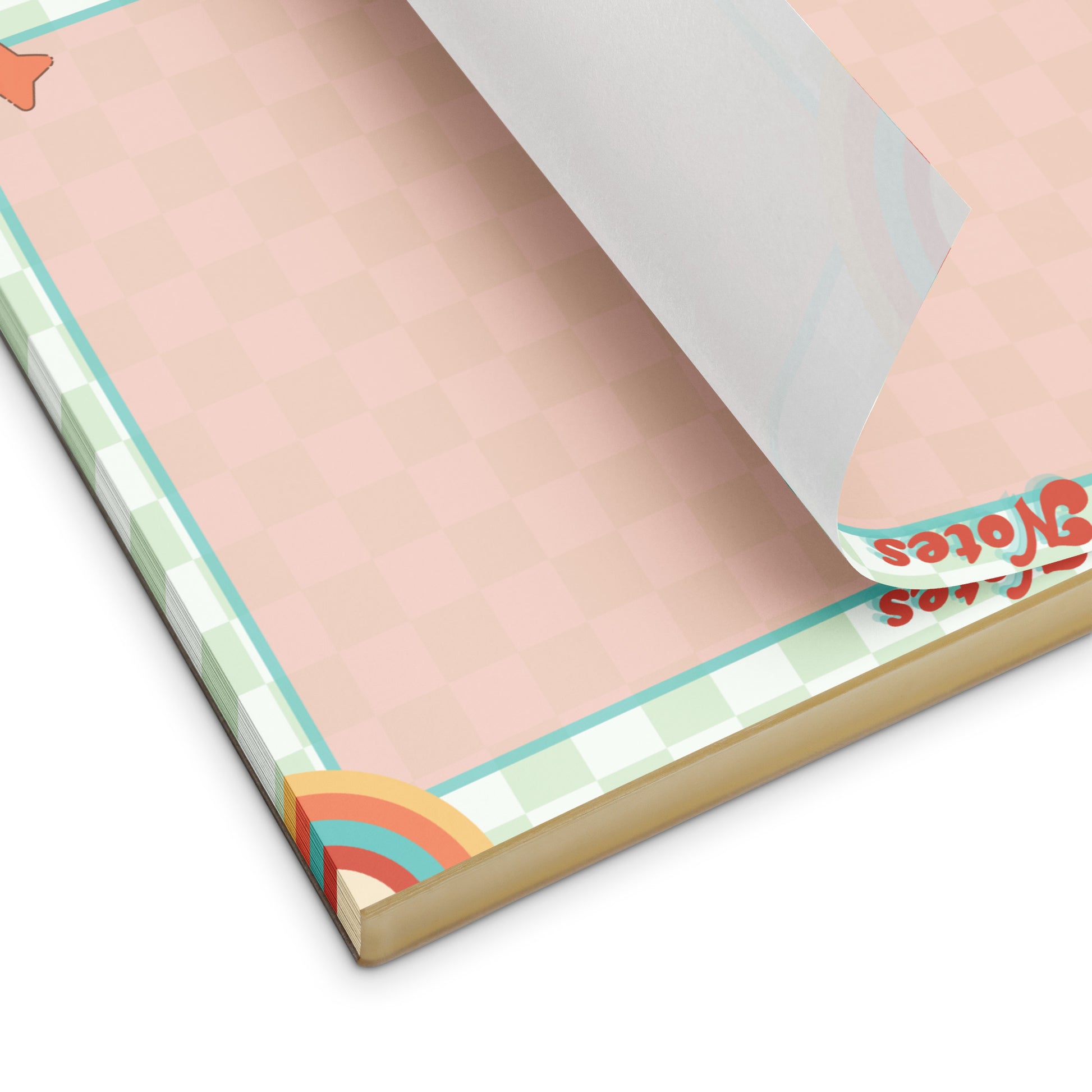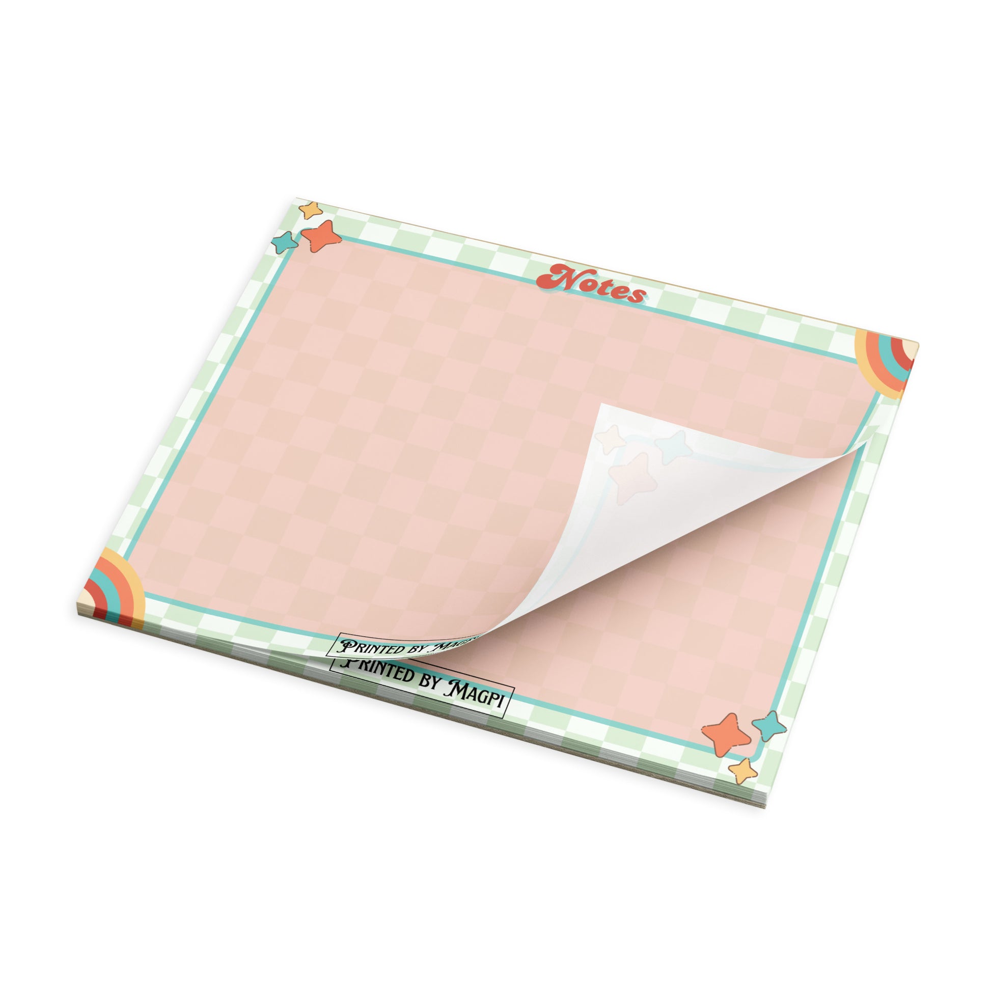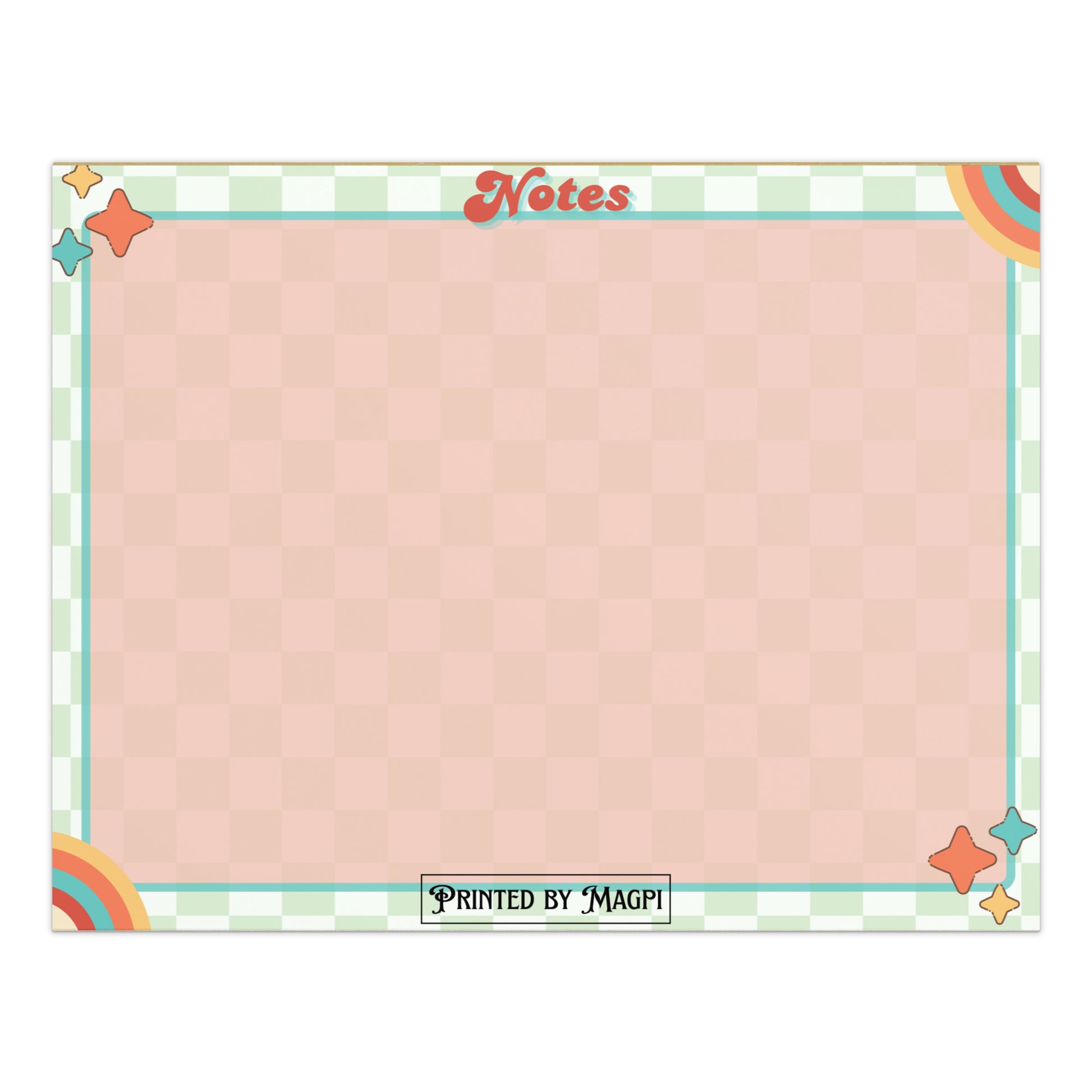 Channel your inner 70s sunshine with this playful notepad, featuring a pastel checkerboard background, bold rainbow corners, and a sprinkle of dancing stars. Whether you’re jotting down magical reminders, sketching spells, or just leaving cute notes, this pad adds a little joy to every scribble.