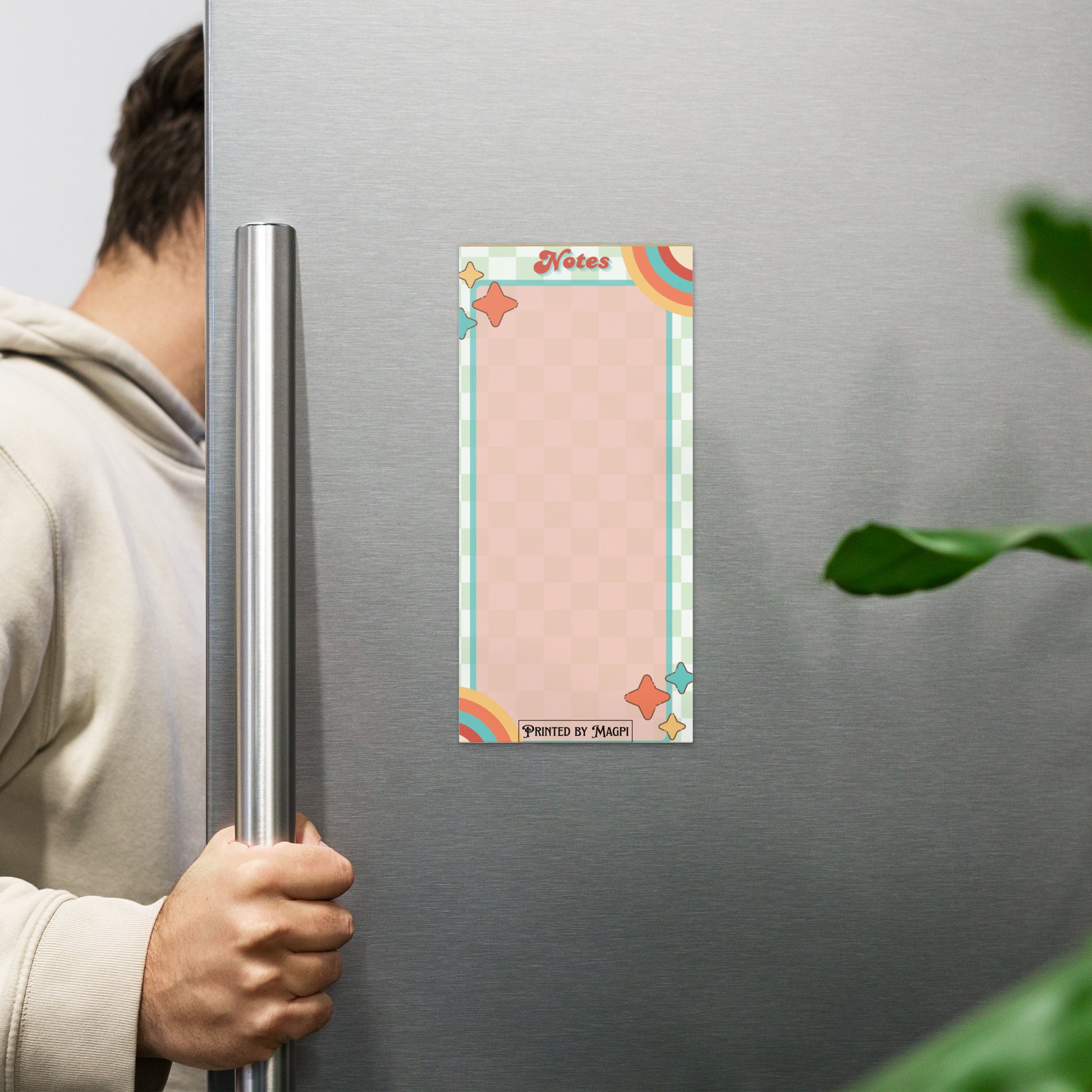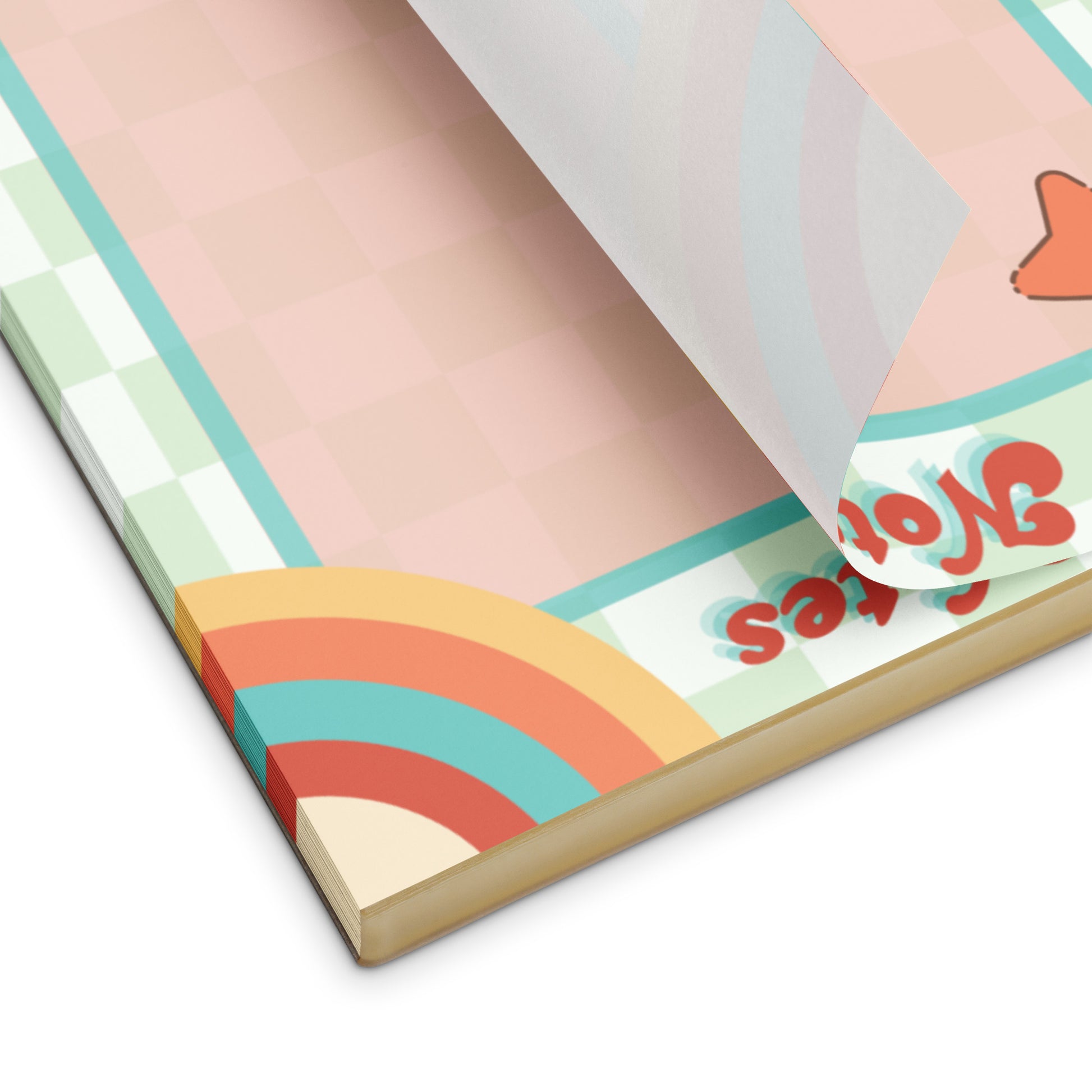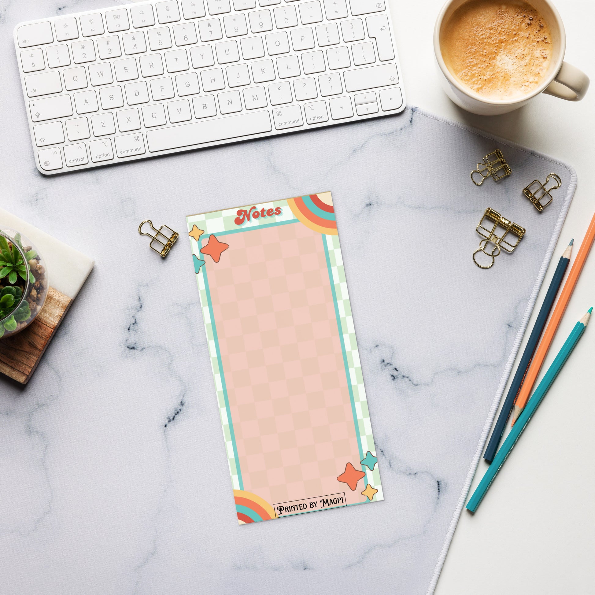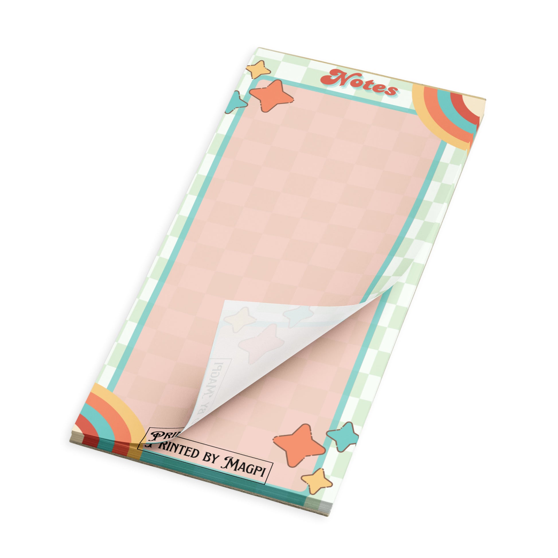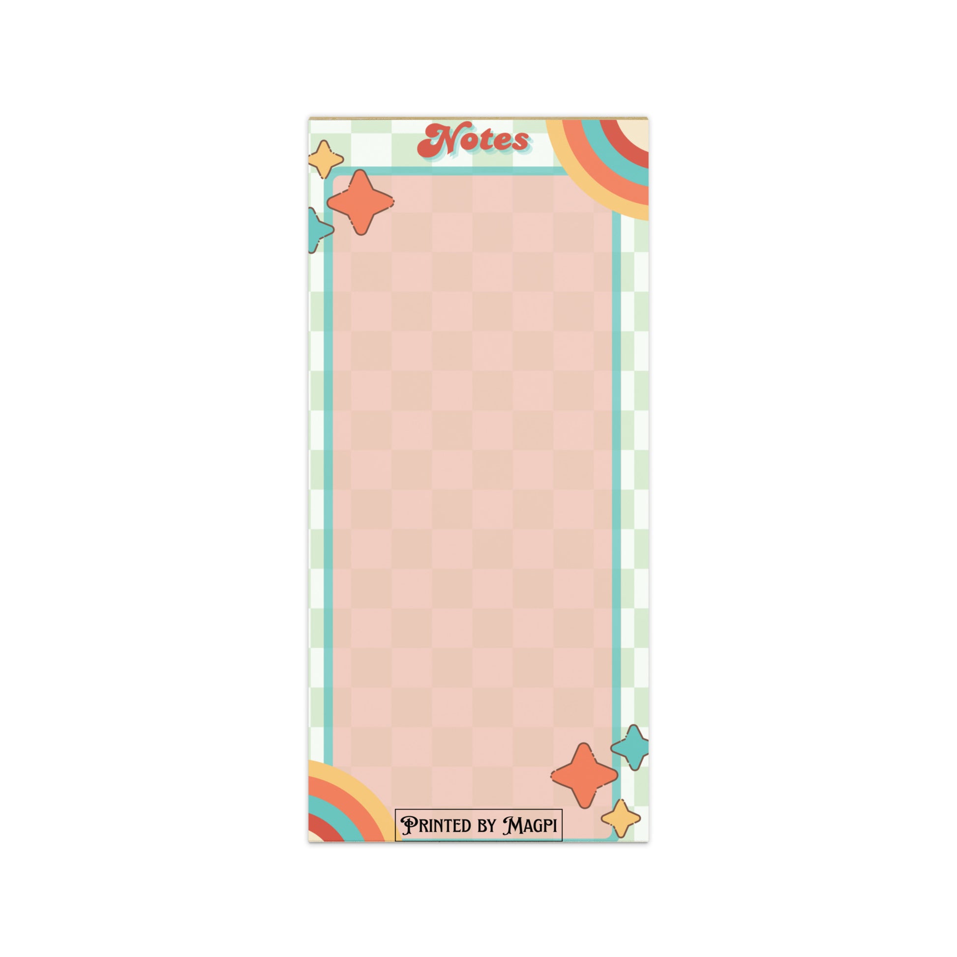 Channel your inner 70s sunshine with this playful notepad, featuring a pastel checkerboard background, bold rainbow corners, and a sprinkle of dancing stars. Whether you’re jotting down magical reminders, sketching spells, or just leaving cute notes, this pad adds a little joy to every scribble.